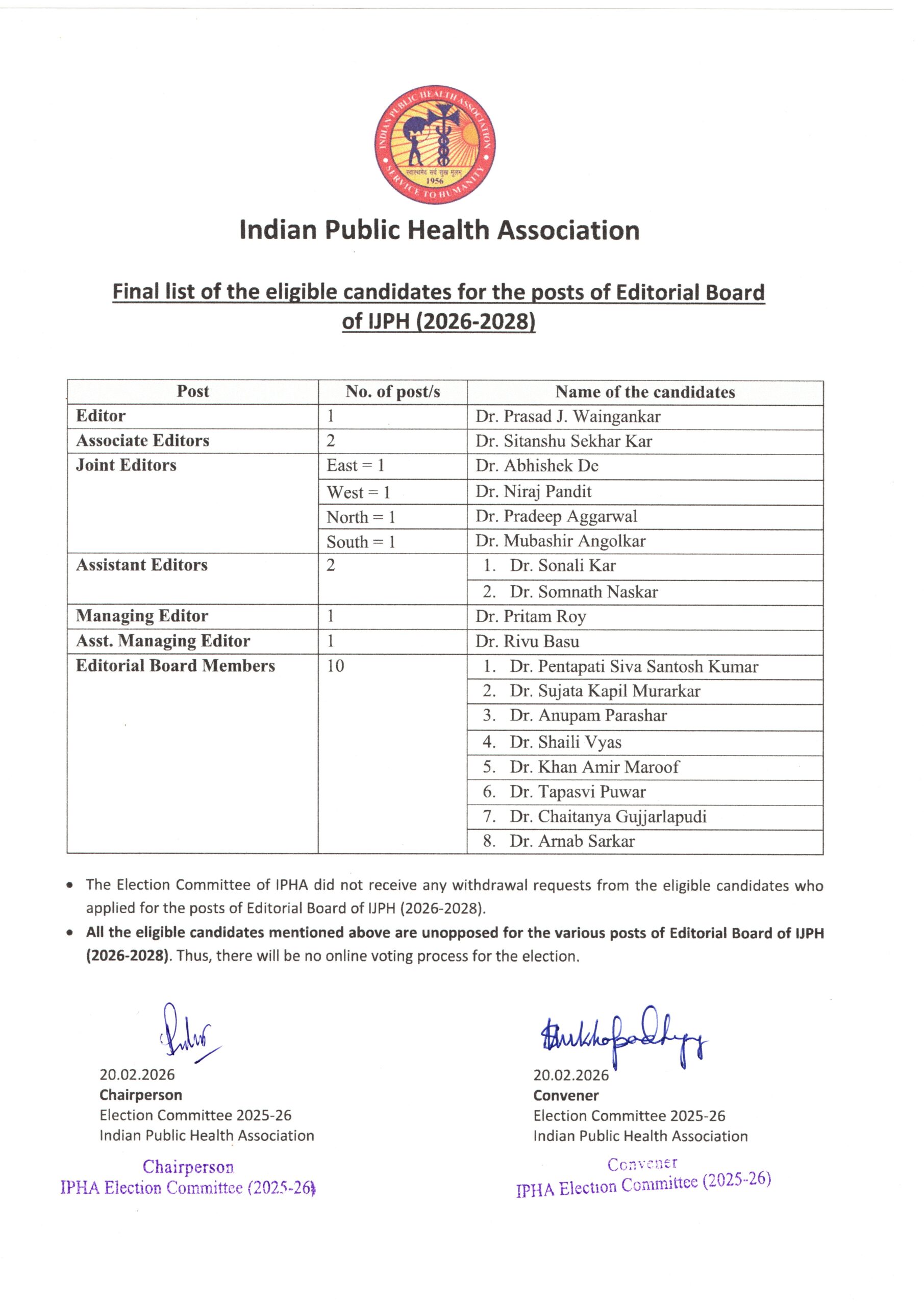 Election Announcements (2026-2028) Final list of the eligible candidates for the posts of Office Bearers and Central Council Members of IPHA (2026-2028) (Click image to open in new tab & zoom) Final list of the eligible candidates for the posts of Editorial Board of IJPH (2026-2028) (Click image to open in new tab & zoom) List of eligible candidates for the posts of Office Bearers, Central Council Members of IPHA (2026-2028) (Click image to open in new tab & zoom) List of eligible candidates for the posts of Editorial Board of IJPH (2026-2028) (Click image to open in new tab & zoom)
